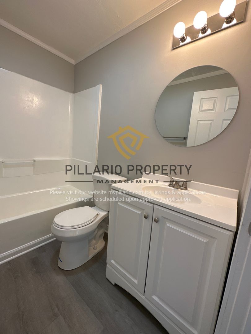 The updated bathroom features a new vanity, mirror, light fixture, toilet, and a bathtub/shower combo, giving the space a fresh, clean feel.